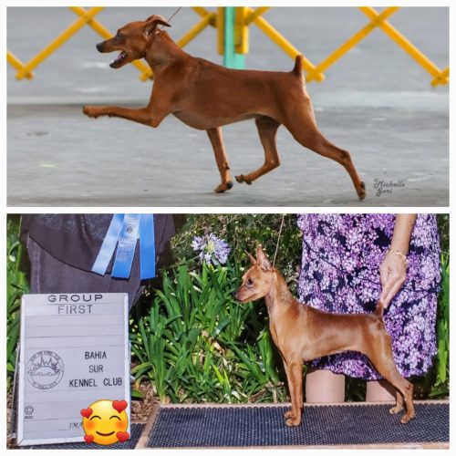 Hellon is a wonderful 11 1/2′ stag girl who is a beautiful combination of her sire Tiberious and dam Periwinkle. I awarded her dam Best in Sweepstakes out of over 70 entries, at the 2017 Miniature Pinscher Club of America National Specialty show. Sadly this was the only litter for Periwinkle. Hellon debuted and not only went Best of breed of Champions at her 2nd show, she also won a Toy Group 1 in a an amazing toy group the lead up weekend to Westminster Kennel Club.